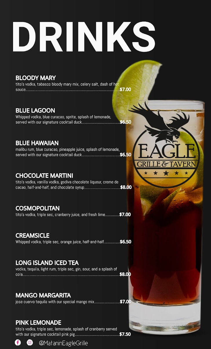 Overall, Eagle Grille & Tavern provides a well-rounded and diverse menu, making it an excellent destination for a casual yet delicious dining experience. With a balance of classic comfort foods and unique signature dishes, there's something for everyone to enjoy.