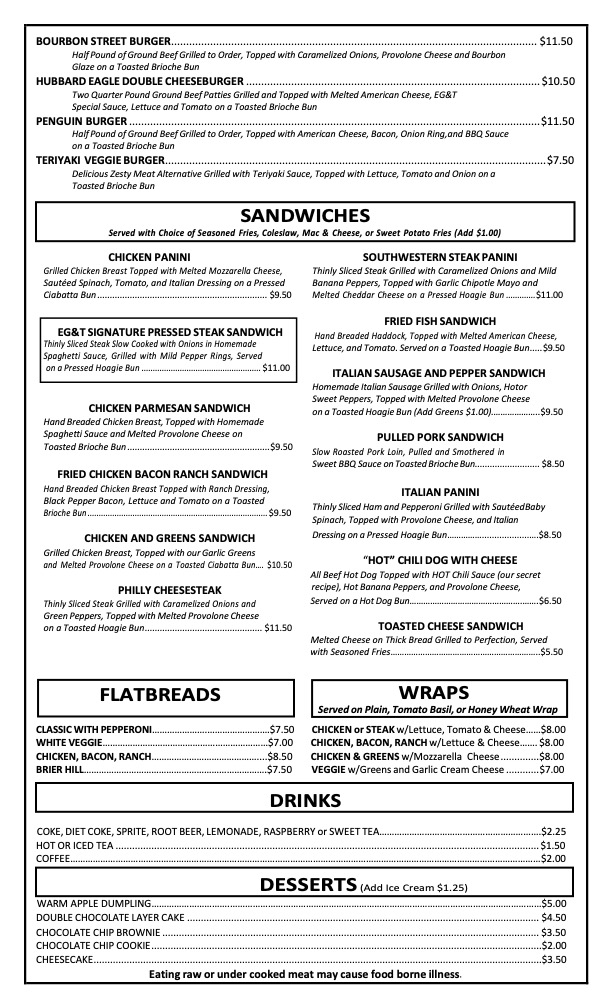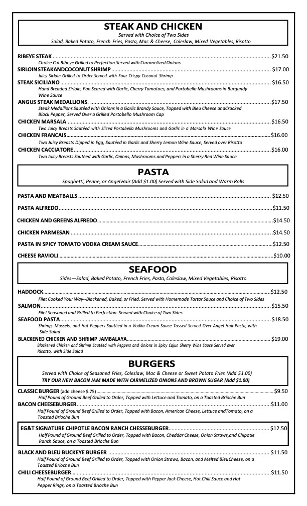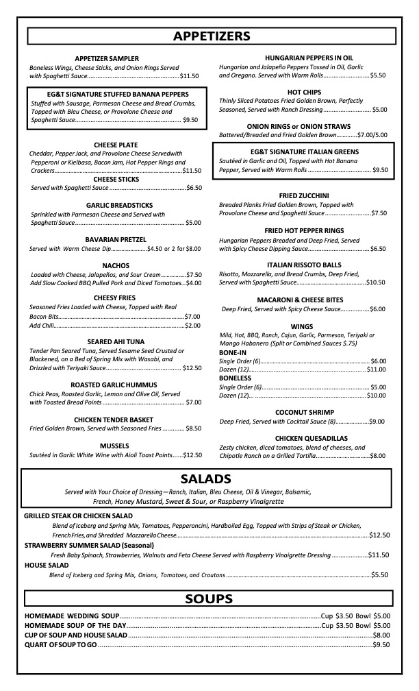 The menu at Eagle Grille & Tavern offers a delightful variety of options for every palate, combining hearty comfort food with a few signature specialties. Starting with appetizers, their Appetizer Sampler is a perfect way to kick off your meal, featuring a selection of tasty bites to share. Another standout is the EG&T Signature Stuffed Banana Peppers, which combines a unique twist of flavors to excite your taste buds.